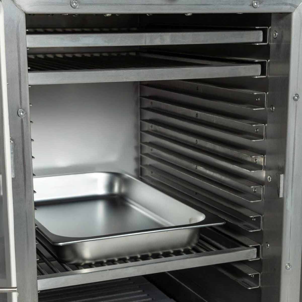 Geliefert wird er mit drei besonders robusten Edelstahlrosten, die perfekt auf den Alltag in Profiküchen abgestimmt sind. Gleichzeitig stehen Euch neun Einschubhöhen zur Verfügung, sodass Ihr mehrere Garzonen gleichzeitig nutzen könnt – ideal für paralleles Grillen, Braten, Smoken oder Warmhalten.