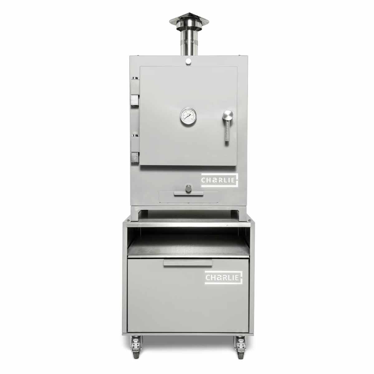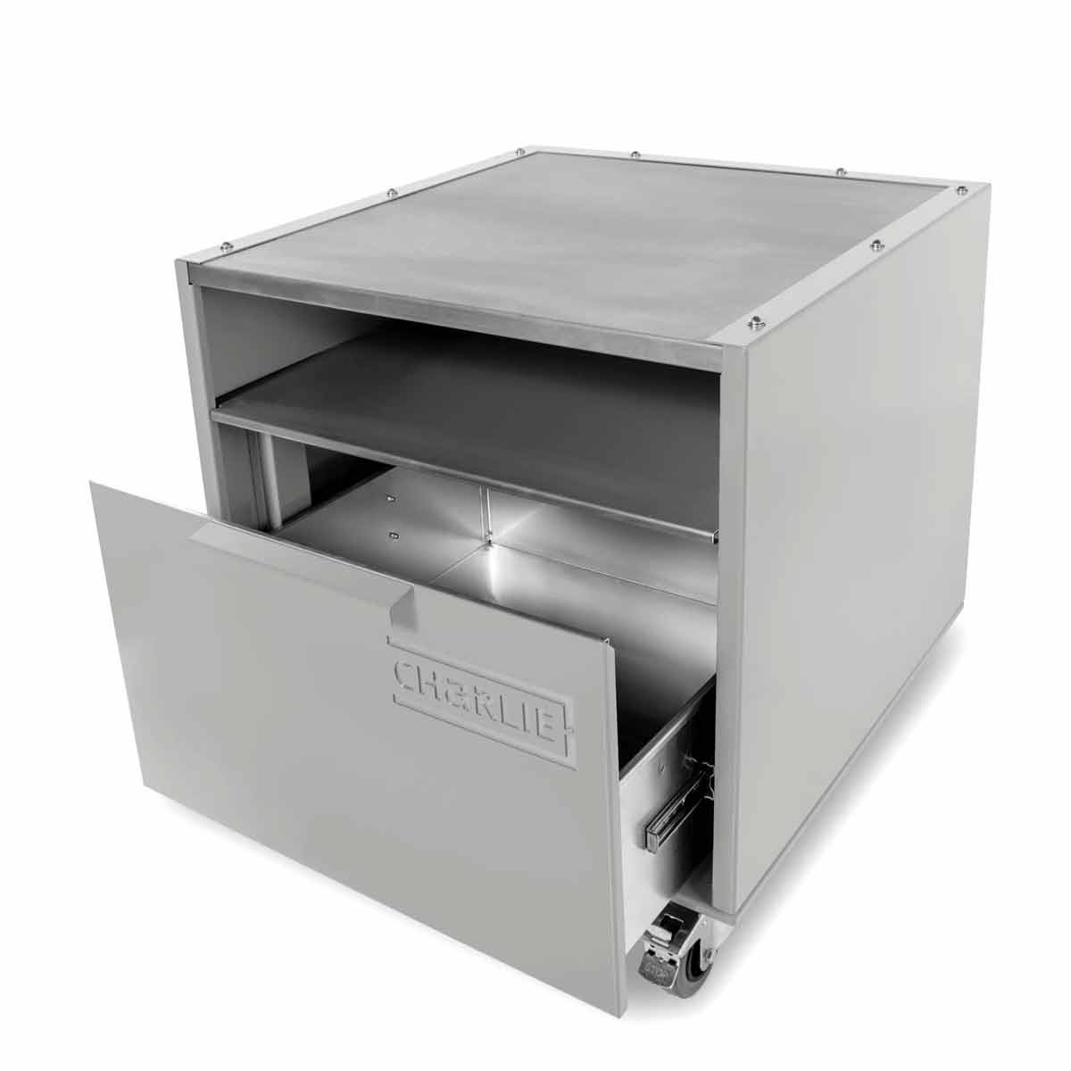 Langlebig, massiv, zuverlässig: Der Unterwagen setzt – typisch Charlie – auf eine hochwertige Edelstahlkonstruktion. Die Edelstahl-Arbeitsfläche trägt Euren Ofen sicher und absolut stabil, während die tiefe Edelstahl-Ablage darunter zusätzlichen Platz für Zubehör und Tools bietet.