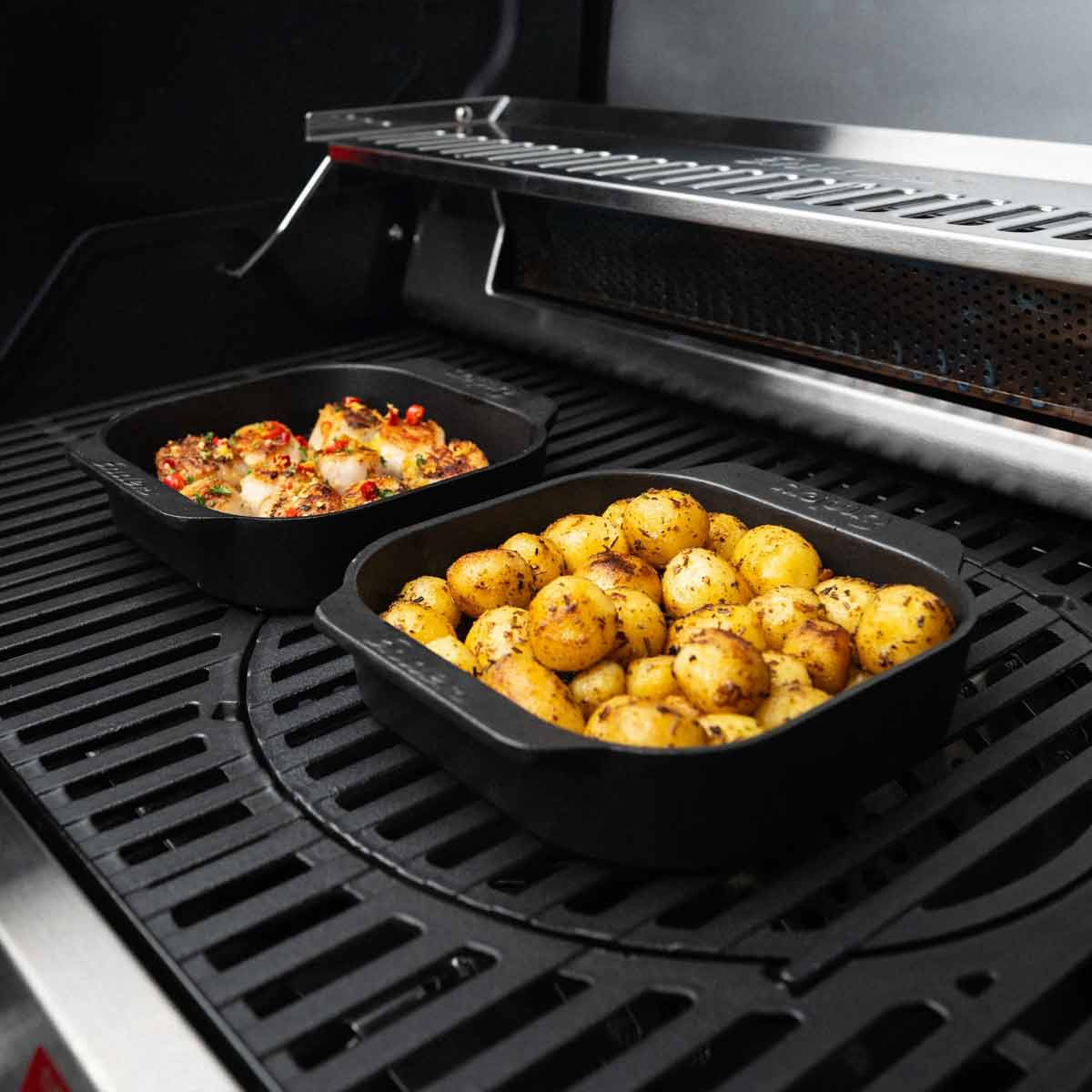 Die beiden Gusseisenschalen messen jeweils 20,5 x 17,5 x 4,5 cm und passen damit perfekt unter den Cruster der Enders Uniq Pro Gasgrills. Durch das robuste Material erhitzen sie sich schnell, speichern die Wärme lange und verteilen sie gleichmäßig – perfekt für Gratins, Soufflés, Quiches oder auch süße Nachspeisen wie Kuchen und Crumble.