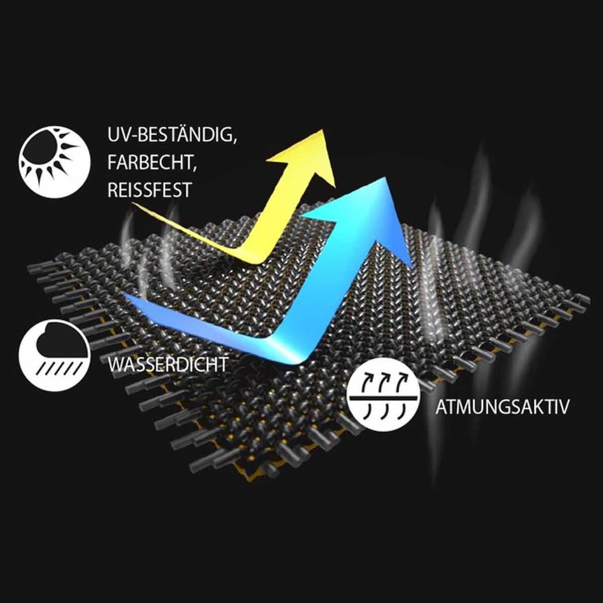 Die PU-beschichtete Oberfläche macht die Haube wasserdicht, während die atmungsaktive Membran dafür sorgt, dass sich kein Kondenswasser oder Staunässe unter der Hülle bildet. Das schützt den Heizstrahler vor Korrosion und sorgt dafür, dass Ihr ihn jederzeit sofort wieder einsatzbereit habt.