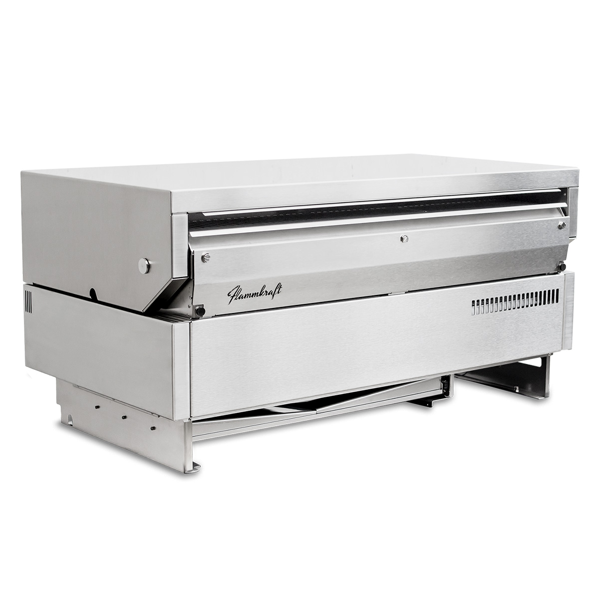 Der darüberliegende Rost bietet zusätzlichen Platz für Grillgut und fängt heruntertropfende Säfte auf, um dem darunterliegenden Grillgut einen köstlichen Geschmack zu verleihen. Das innovative Brennerkonzept von Flammkraft ermöglicht es, die Schalen entweder direkt durch den darunterliegenden Brenner zu befeuern oder sie über Konvektion mit dem vorderen Brenner zu erhitzen – oder beides gleichzeitig.