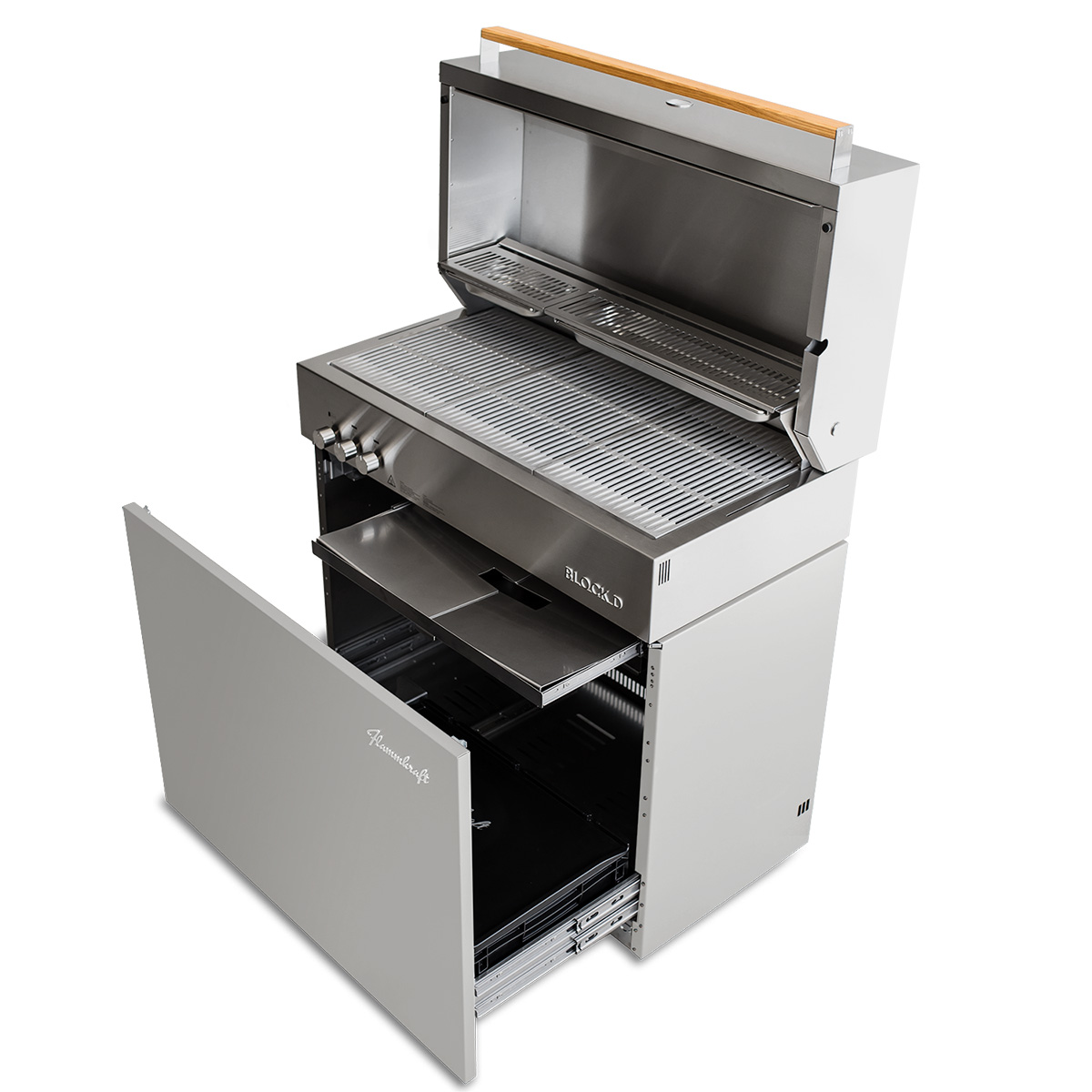 Das innovative Brennerkonzept von Flammkraft ermöglicht es, die Schalen entweder direkt durch den darunterliegenden Brenner zu befeuern oder sie über Konvektion mit dem vorderen Brenner zu erhitzen – oder beides gleichzeitig. Wenn die Edelstahlschalen gerade nicht für Beilagen oder Nachspeisen gebraucht werden, können sie leicht entnommen und im Unterbau des Block D aufbewahrt werden. Die klappbaren Roste des OfenDock sorgen für eine komfortable Nutzung des gesamten Grillbereichs und ermöglichen jederzeit bequemen Zugang zur gesamten Grillfläche.