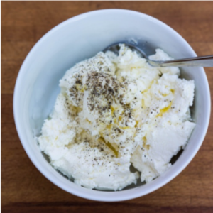 Frischkäse mit Olivenöl verrühren und mit Pfeffer und Salz kräftig würzen.