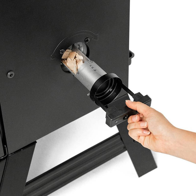 - Patentierter Hackschnitzellader: Fügt kontinuierlich Raucharoma hinzu, ohne die Tür öffnen zu müssen, dank des seitlichen Hackschnitzelladers.