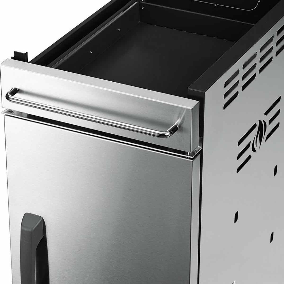 Die integrierte Schublade bietet schnellen Zugriff auf häufig genutzte Grillutensilien, Gewürze oder Accessoires, während der Griff zugleich als Handtuchhalter dient – praktisch und platzsparend zugleich.