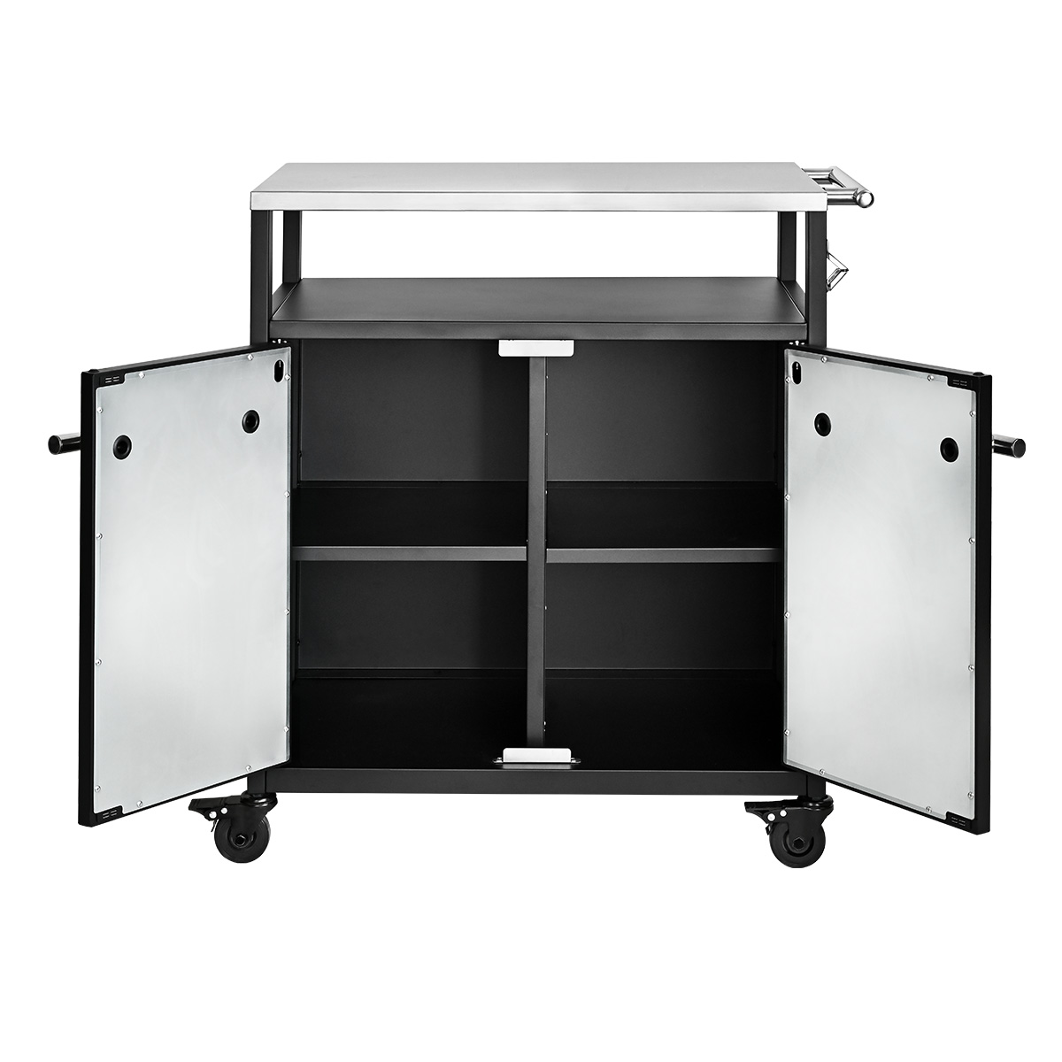 Die großzügige Edelstahl-Arbeitsfläche bietet Euch reichlich Platz zum Vorbereiten, Anrichten und Ablegen von Zutaten und Zubehör. Unterhalb der Fläche befindet sich ein offenes Fach – ideal für Kräuter, Grillzangen oder Marinaden. Hinter den beiden Türen verstecken sich zwei Regalböden, so dass Ihr auch innen Euer Equipment ordentlich lagern könnt.
