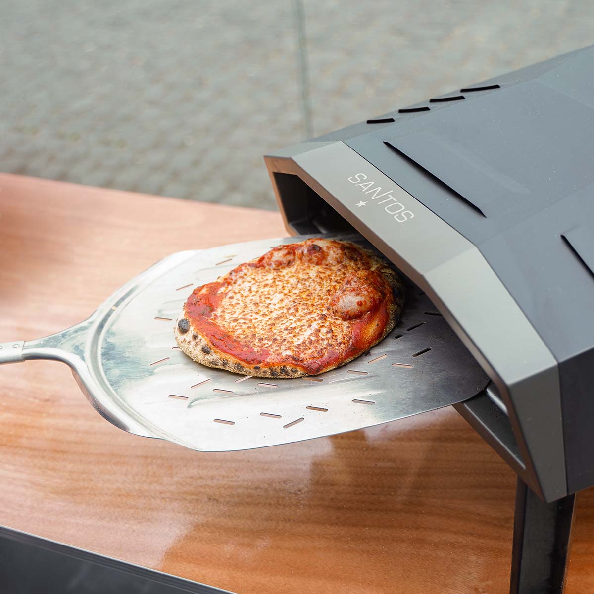 Dank des durchdachten Designs des SANTOS Pizzaofens strömt die die Hitze gleichmäßig vom Fokuspunkt, der sich im hinteren Bereich des Pizzaofens befindet, nach vorne. So backt Eure Pizza schön gleichmäßig aus und in Kombination mit dem innovativen SANTOS Drehteller bekommt Ihr traumhafte, knusprige Pizzen.