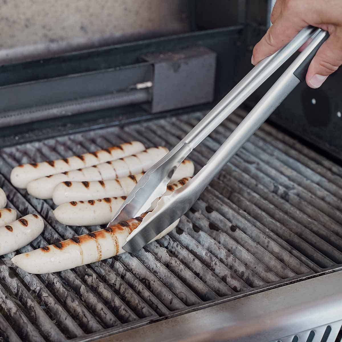 Mit der Grillzange von SANTOS gebt Ihr die Kontrolle beim Drehen und Wenden nicht aus der Hand. Der eckige Zangenkopf hat eine flache Greifseite, mit der Ihr problemlos unter das Grillgut gleitet, während die gezahnte Seite Eure Leckereien fest und sicher greifen. XXL-Steak, Würstchen, Burger, Maiskolben oder Hähnchenkeulen – die Grillzange von SANTOS eignet sich perfekt für große und kleine Zutaten und ermöglicht Euch das sichere und präzise Zugreifen.