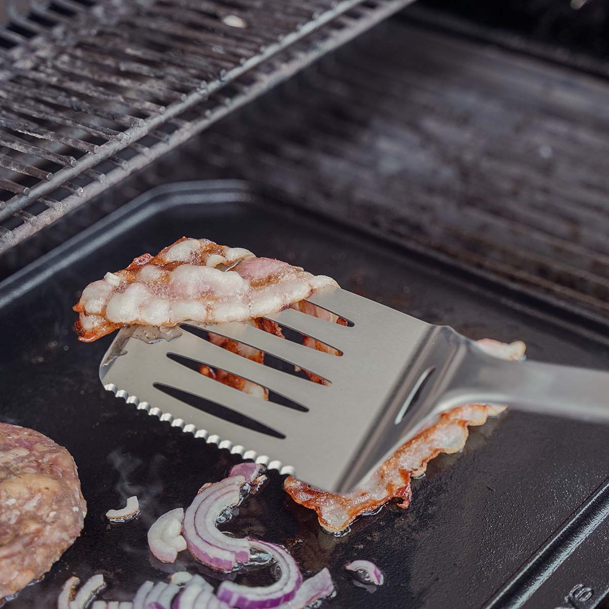 Die extraflache Schaufelkante rutscht ganz leicht unter das Grillgut, so könnt Ihr auch Spiegeleier oder Pancakes problemlos anheben und Euer Grillgut behält seine Form. Auf der großen rechteckigen Schaufelfläche ist auch das Hantieren mit XL Fleischstücken und Fisch ein Kinderspiel. Die seitliche Schneidekante ermöglicht ein einfaches Zerteilen und Portionieren des Grillgutes. So könnt Ihr Fleisch oder Fisch direkt auf dem Grill zerkleinern und mundgerecht servieren.